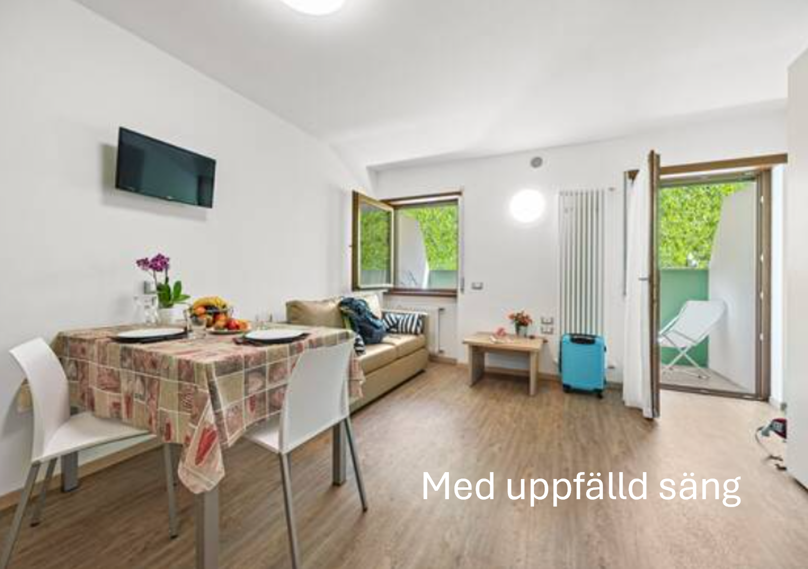 De studio lägenheter vi erbjuder 2027 är för två personer om 25 kvm med vardags-/matplats, en hopfällbar dubbelsäng, kokvrå med kökstillbehör, badrum med dusch. Lägenheten nås med hiss. Se bilder på studio lägenheterna nedan.