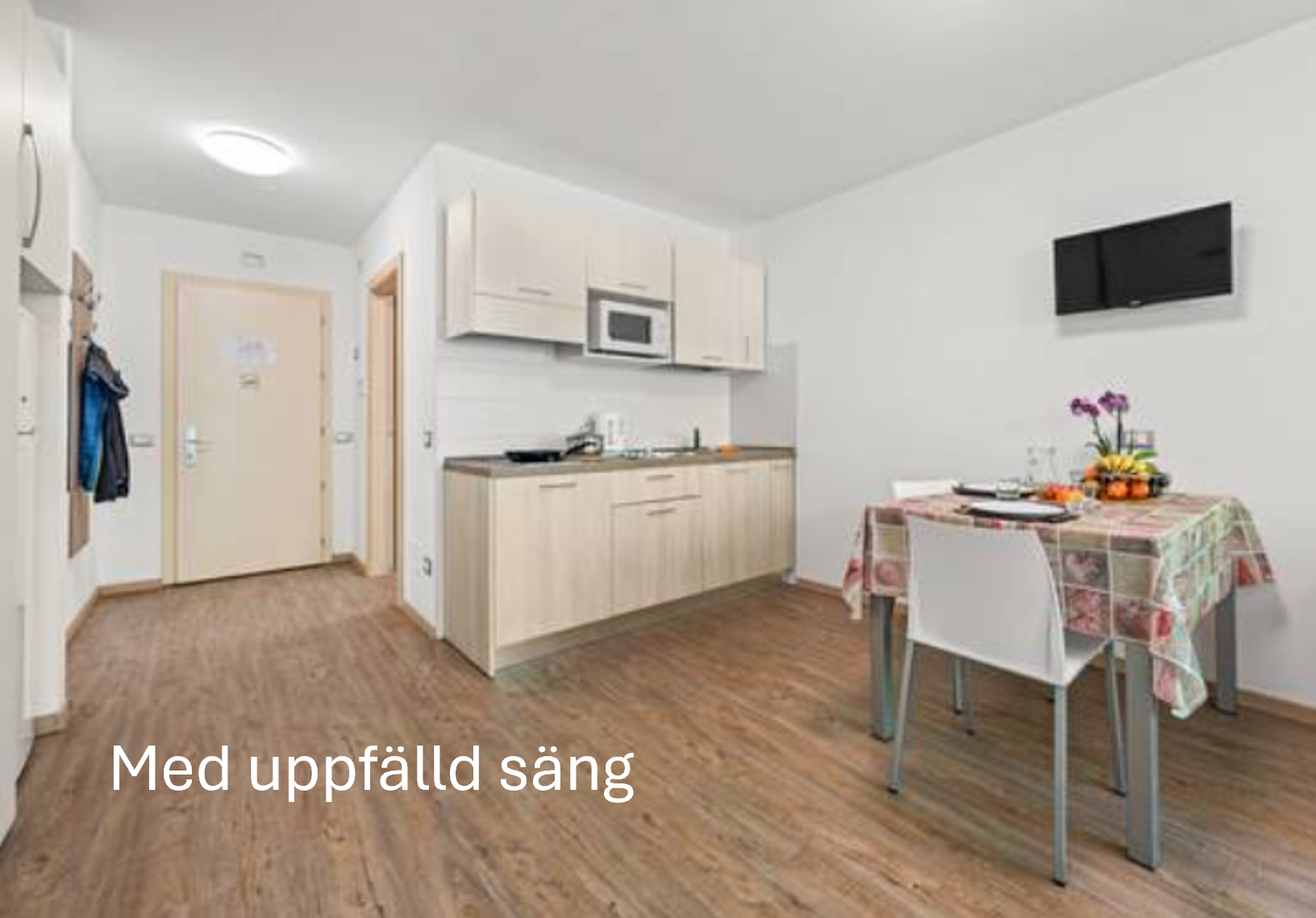 De studio lägenheter vi erbjuder 2027 är för två personer om 25 kvm med vardags-/matplats, en hopfällbar dubbelsäng, kokvrå med kökstillbehör, badrum med dusch. Lägenheten nås med hiss. Se bilder på studio lägenheterna nedan.